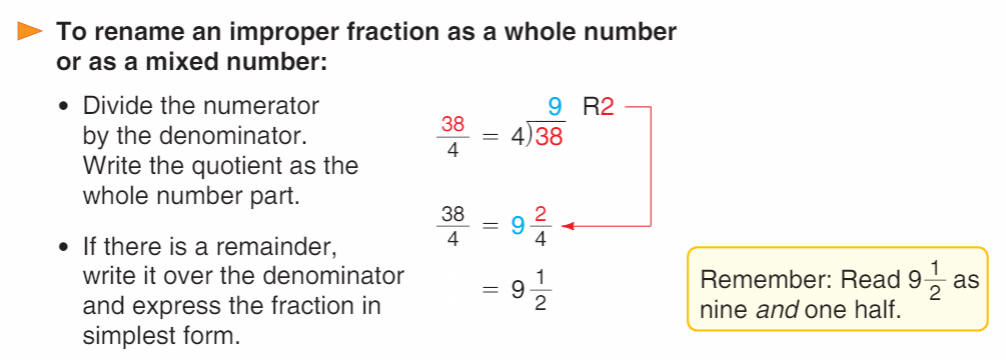 So we can rewrite our improper fraction (38 fourths) as a mixed number (9 and 1 half):