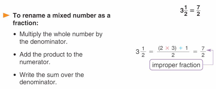 You may be asked to rewrite a "mixed number" as an improper fraction (which is the reverse of what we just did above). This example is also in your book on page 190: