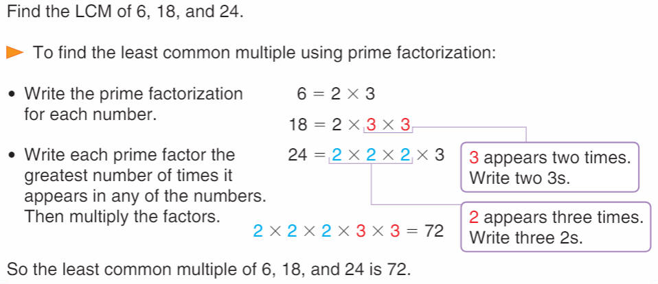 Example: find the LCM of 6, 18, and 24 by multiplying each number by 1, then 2, then 3, etc.: